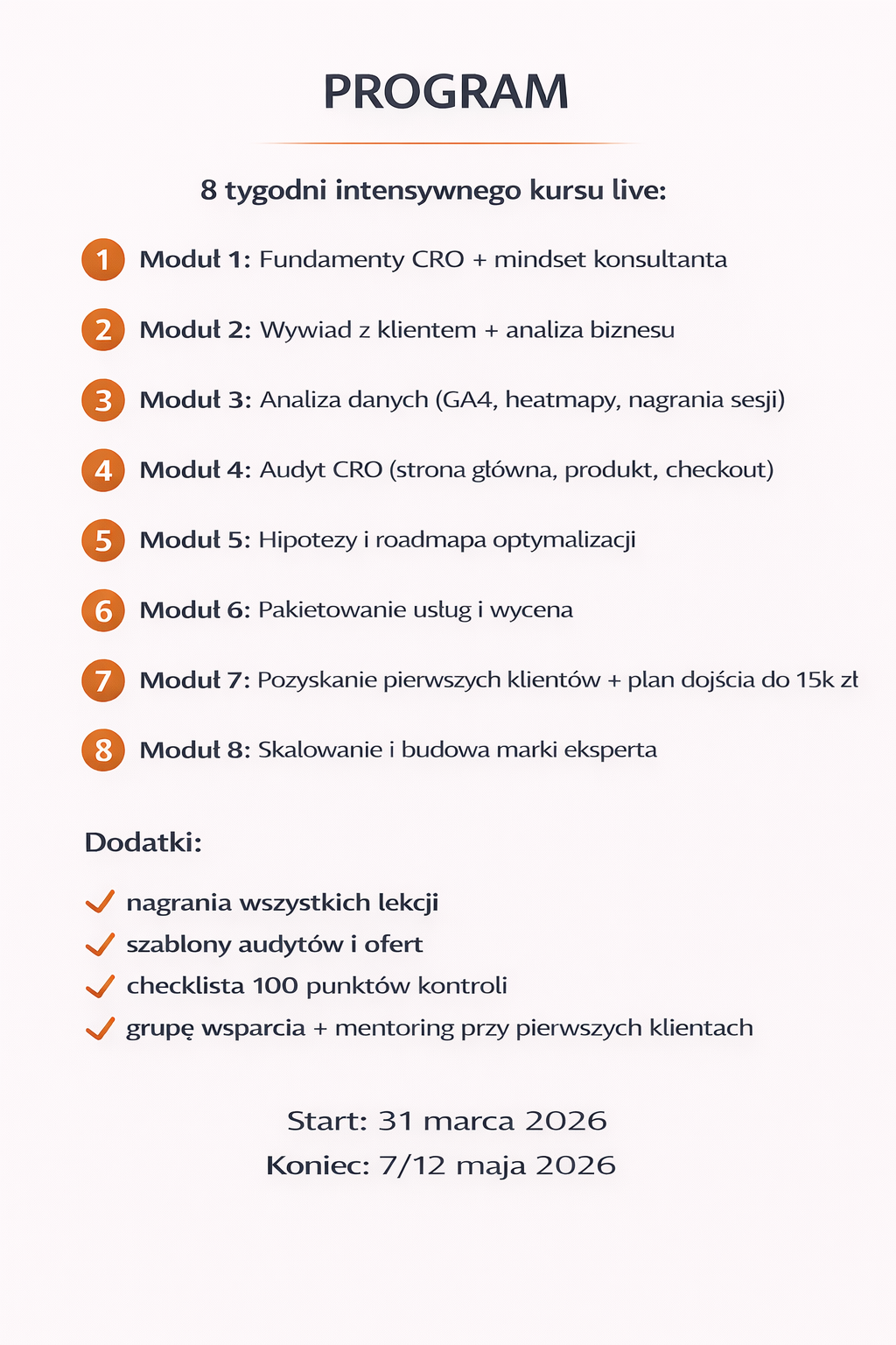 6-tygodniowy program live z certyfikatem + gotowe szablony audytów, ofert i roadmap do pierwszych klientów.